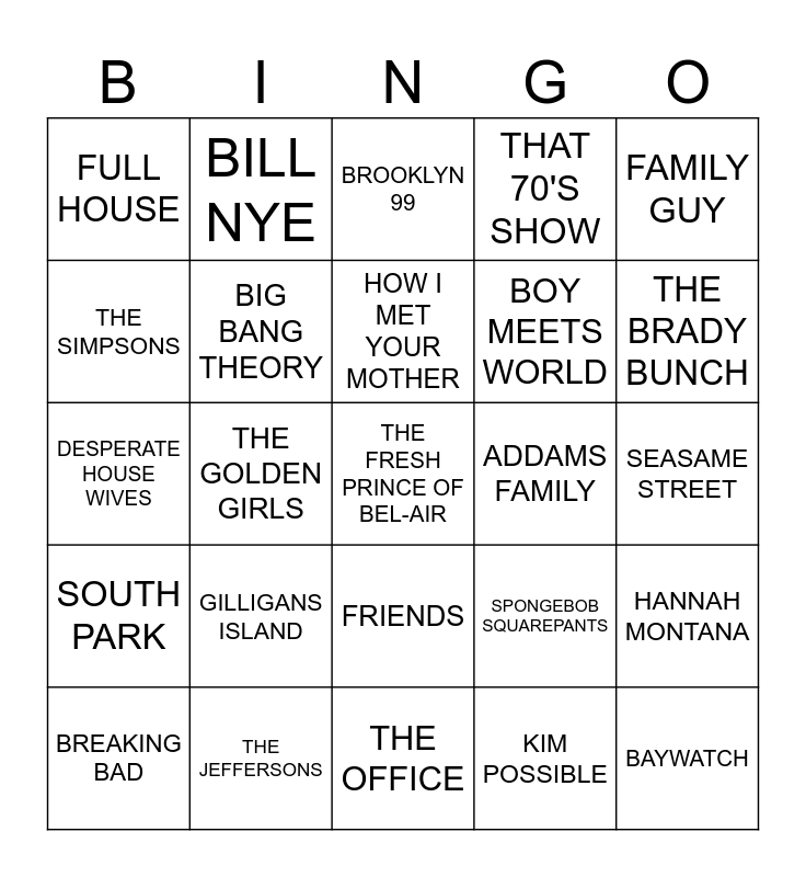 This bingo card has 39 words: STRANGER THINGS, THE WALKING DEAD, ORANGE IS THE NEW BLACK, BIG BANG THEORY, BREAKING BAD, FRIENDS, HOW I MET YOUR MOTHER, SHAMELESS, FAMILY GUY, SOUTH PARK, THE GOLDEN GIRLS, THAT 70'S SHOW, THE FRESH PRINCE OF BEL-AIR, SEASAME STREET, ADDAMS FAMILY, GILLIGANS ISLAND, SEINFELD, FULL HOUSE, BEVERLY HILLS 90210, SPONGEBOB SQUAREPANTS, THE SIMPSONS, THE OFFICE, BOY MEETS WORLD, THE BRADY BUNCH, THE JETSONS, GAME OF THRONES, BAYWATCH, SCRUBS, THE FLINSTONES, BILL NYE, PARKS AND REC, BOBS BURGER, BROOKLYN 99, THE JEFFERSONS, KIM POSSIBLE, THATS SO RAVEN, HANNAH MONTANA, DESPERATE HOUSE WIVES and CHEERS.