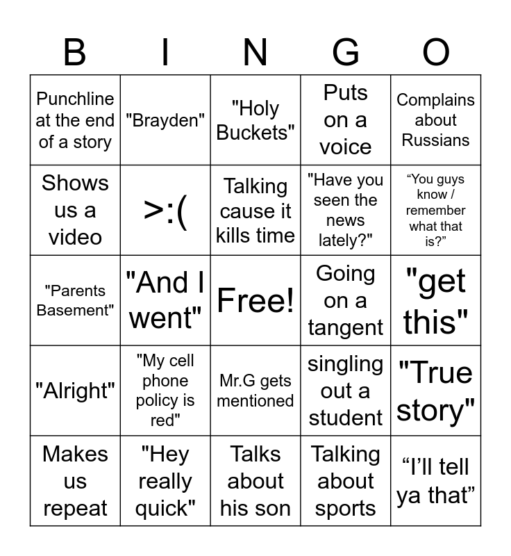 This bingo card has a free space and 24 words: "My cell phone policy is red", "Hey really quick", Talking cause it kills time, Makes us repeat, Complains about Russians, Punchline at the end of a story, Shows us a video, "Brayden", Going on a tangent, Mr.G gets mentioned, "Have you seen the news lately?", "Parents Basement", singling out a student, "True story", >:(, Talking about sports, "get this", "Holy Buckets", “You guys know / remember what that is?”, "And I went", “I’ll tell ya that”, "Alright", Puts on a voice and Talks about his son.