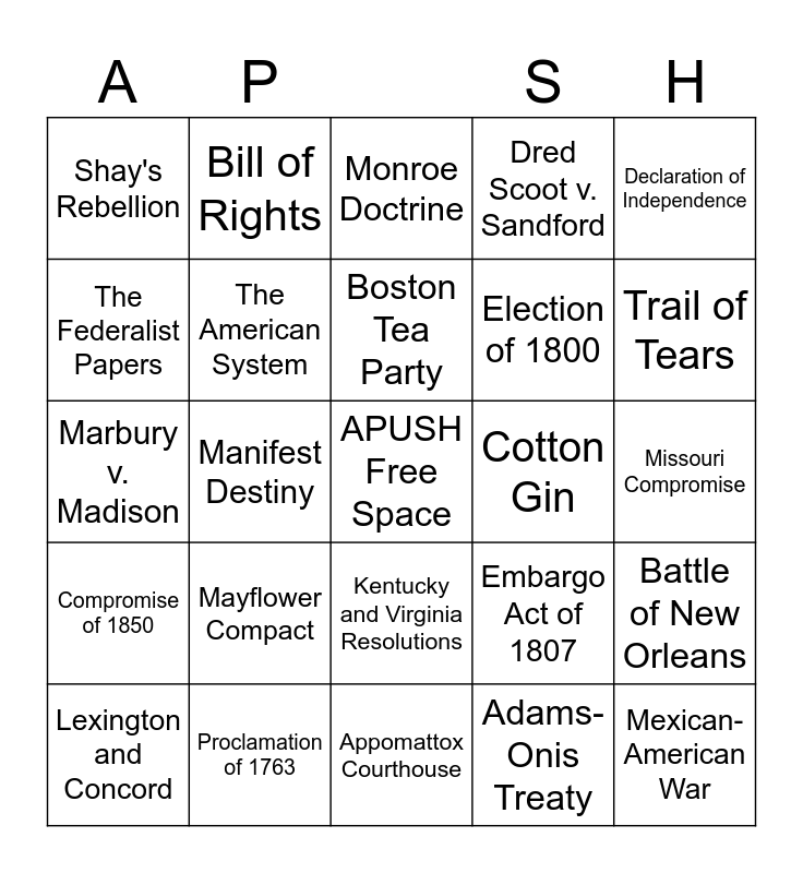This bingo card has a free space and 24 words: Mayflower Compact, Proclamation of 1763, Boston Tea Party, Lexington and Concord, Declaration of Independence, Shay's Rebellion, The Federalist Papers, Bill of Rights, Cotton Gin, Kentucky and Virginia Resolutions, Election of 1800, Marbury v. Madison, Embargo Act of 1807, Battle of New Orleans, The American System, Adams-Onis Treaty, Missouri Compromise, Monroe Doctrine, Trail of Tears, Manifest Destiny, Mexican-American War, Compromise of 1850, Dred Scoot v. Sandford and Appomattox Courthouse.