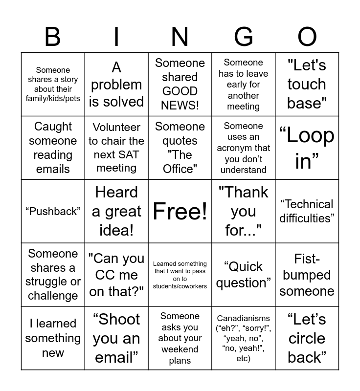 This bingo card has a free space and 25 words: "Can you CC me on that?", Someone asks you about your weekend plans, Someone quotes "The Office", I learned something new, "Let's touch base", Someone shares a story about their family/kids/pets, Caught someone reading emails, A problem is solved, "Thank you for...", Learned something that I want to pass on to students/coworkers, Someone uses an acronym that you don’t understand, “Pushback”, “Quick question”, Fist-bumped someone, Volunteer to chair the next SAT meeting, I’m responsible for a new action item, “Technical difficulties”, Someone shared GOOD NEWS!, “Loop in”, Heard a great idea!, “Let’s circle back”, “Shoot you an email”, Someone shares a struggle or challenge, Someone has to leave early for another meeting and Canadianisms (“eh?”, “sorry!”, “yeah, no”, “no, yeah!”, etc).