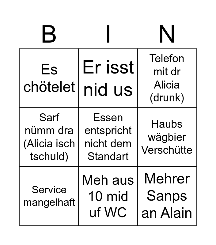 This bingo card has a free space and 8 words: Haubs wägbier Verschütte, Telefon mit dr Alicia (drunk), Er isst nid us, Service mangelhaft, Es chötelet, Mehrer Sanps an Alain, Sarf nümm dra (Alicia isch tschuld) and Meh aus 10 mid uf WC.