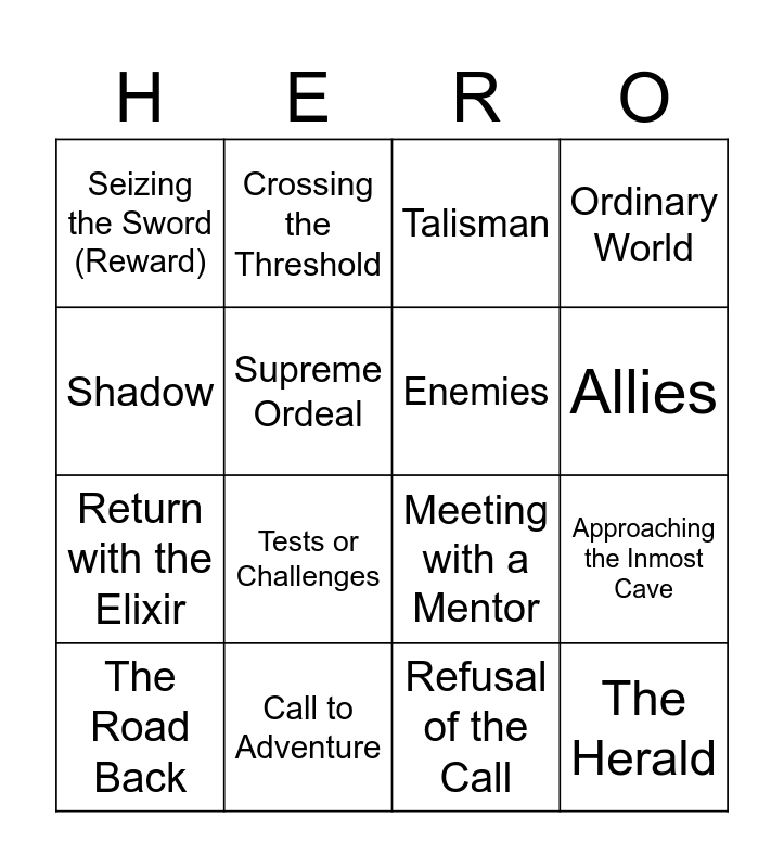 This bingo card has 16 words: Call to Adventure, Approaching the Inmost Cave, Talisman, Seizing the Sword (Reward), Return with the Elixir, Crossing the Threshold, Meeting with a Mentor, Refusal of the Call, Shadow, Supreme Ordeal, The Road Back, Ordinary World, Tests or Challenges, Allies, Enemies and The Herald.