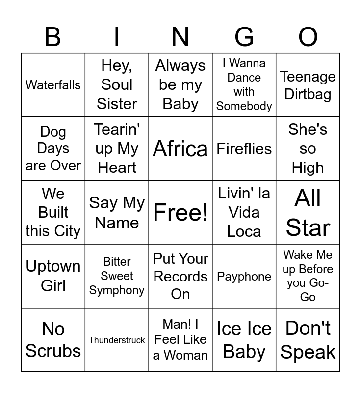 This bingo card has a free space and 29 words: No Scrubs, I Want it That Way, Say My Name, ...Baby one More Time, Waterfalls, Always be my Baby, Tearin' up My Heart, Bitter Sweet Symphony, Livin' la Vida Loca, Thunderstruck, All Star, Don't Speak, Man! I Feel Like a Woman, Ice Ice Baby, She's so High, No One, Put Your Records On, Uptown Girl, Teenage Dirtbag, We Built this City, Payphone, Haven't Met You Yet, Fireflies, Dog Days are Over, I Wanna Dance with Somebody, Hey, Soul Sister, Wake Me up Before you Go-Go, Africa and Walking on Sunshine.