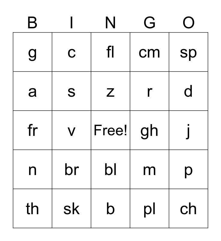 This bingo card has a free space and 44 words: sh, ch, wh, th, ph, pl, fl, dr, sp, sk, cm, gh, bl, br, cl, b, cr, fr, ck, d, c, e, f, g, h, j, k, l, m, n, o, p, qu, u, v, w, x, y, z, a, r, i, s and t.