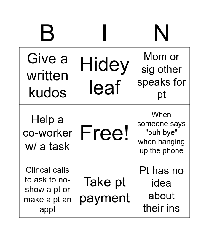 This bingo card has a free space and 24 words: "Are we contracted w/ that ins", Talked to a pt upstairs, Take pt payment, Help a co-worker with a task, Pt has no idea about their ins, Give a written kudos, When someone says "buh bye" when hanging up the phone, Hidey leaf, Pt pays with cash, A pt says "Buh bye" when hanging up the phone or walking out, Pt no-shows, Pt stops and asks if they needs to check out, Pt declines to take a picture, Pt didn't bring ins card, Clincal calls to ask to no-show a pt or make a pt an appt, Surgery slot not filled and schedule opens for add-ons, Help a co-worker w/ a task, Mom or sig other speaks for pt, Same day cancel, Scheduled pt from waitlist on any schedule, Someone didn't do their phreesia, Same day add-on/ ok to see a 15 + min late pt, any sched, Help a co-worker w/ a task and TE/LPack running behind.