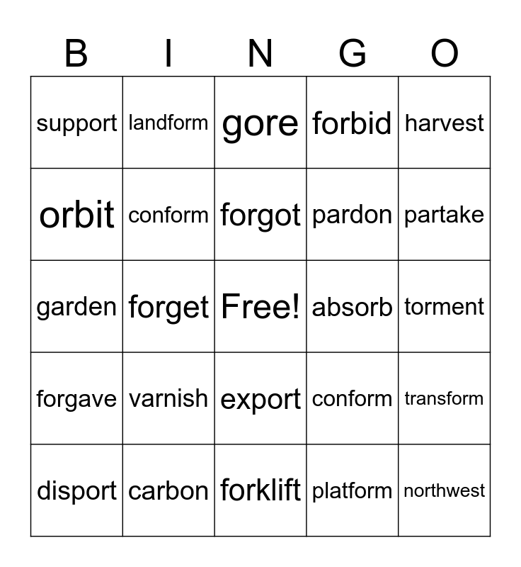 This bingo card has a free space and 35 words: import, impart, inform, conform, export, forbid, orbit, carpet, forgot, organ, garden, harvest, market, Arctic, support, absorb, platform, forget, forgave, northwest, conform, disport, transform, carbon, gore, partake, garnish, distort, pardon, torment, ornate, forklift, varnish, landform and foghorn.