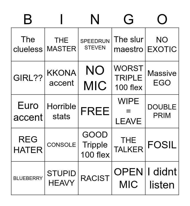 This bingo card has a free space and 24 words: BLUEBERRY, CONSOLE, NO MIC, OPEN MIC, NO EXOTIC, The clueless, THE MASTER, SPEEDRUN STEVEN, WIPE = LEAVE, DOUBLE PRIM, Euro accent, KKONA accent, THE TALKER, FOSIL, GIRL??, STUPID HEAVY, RACIST, The slur maestro, Massive EGO, REG HATER, Horrible stats, GOOD Tripple 100 flex, WORST TRIPLE 100 flex and I didnt listen.