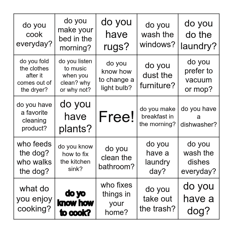 This bingo card has a free space and 24 words: do you know how to fix the kitchen sink?, do yo know how to cook?, do you know how to change a light bulb?, what do you enjoy cooking?, do you do the laundry?, do you cook everyday?, do you fold the clothes after it comes out of the dryer?, do you make your bed in the morning?, do you make breakfast in the morning?, do you clean the bathroom?, do you dust the furniture?, do you have a favorite cleaning product?, do you have a laundry day?, do you wash the dishes everyday?, do you listen to music when you clean? why or why not?, do you take out the trash?, do you have a dishwasher?, do you have rugs?, do you prefer to vacuum or mop?, do you have plants?, do you have a dog?, who feeds the dog? who walks the dog?, do you wash the windows? and who fixes things in your home?.