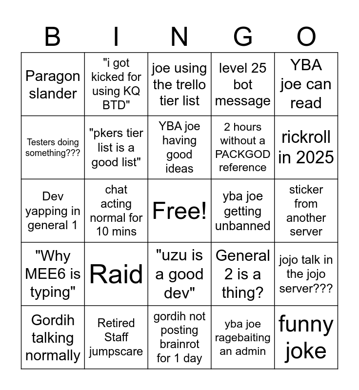 This bingo card has a free space and 24 words: Raid, Retired Staff jumpscare, YBA joe having good ideas, Gordih talking normally, YBA joe can read, Paragon slander, Testers doing something???, "i got kicked for using KQ BTD", yba joe getting unbanned, "uzu is a good dev", 2 hours without a PACKGOD reference, Dev yapping in general 1, General 2 is a thing?, jojo talk in the jojo server???, "pkers tier list is a good list", yba joe ragebaiting an admin, sticker from another server, joe using the trello tier list, rickroll in 2025, chat acting normal for 10 mins, funny joke, "Why MEE6 is typing", level 25 bot message and gordih not posting brainrot for 1 day.
