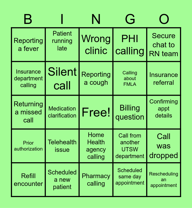 This bingo card has a free space and 24 words: Refill encounter, Telehealth issue, Reporting a cough, Scheduled same day appointment, Secure chat to RN team, Reporting a fever, Patient running late, Wrong clinic, Billing question, Confirming appt details, Returning a missed call, Silent call, Call from another UTSW department, Call was dropped, Insurance department calling, Scheduled a new patient, Pharmacy calling, PHI calling, Insurance referral, Prior authorization, Medication clarification, Home Health agency calling, Calling about FMLA and Rescheduling an appointment.