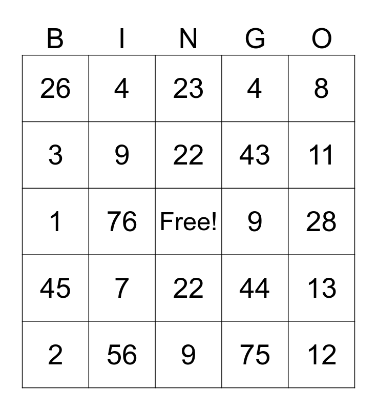 This bingo card has a free space and 24 words: 7, 56, 22, 2, 8, 26, 3, 4, 9, 22, 43, 1, 44, 13, 9, 75, 28, 23, 11, 76, 12, 45, 4 and 9.