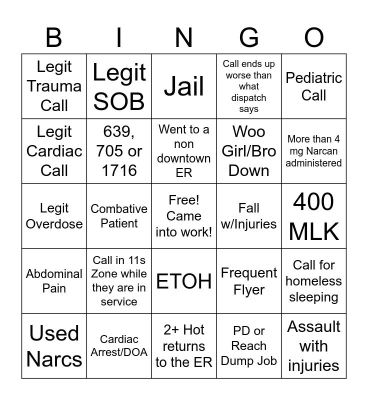 This bingo card has a free space and 24 words: Call in 11s Zone while they are in service, Cardiac Arrest/DOA, Went to a non downtown ER, Used Narcs, Pediatric Call, Legit Trauma Call, Legit Cardiac Call, Legit SOB, Fall w/Injuries, ETOH, Woo Girl/Bro Down, Legit Overdose, Frequent Flyer, Call for homeless sleeping, 639, 705 or 1716, PD or Reach Dump Job, 400 MLK, Jail, More than 4 mg Narcan administered, Combative Patient, Assault with injuries, Abdominal Pain, Call ends up worse than what dispatch says and 2+ Hot returns to the ER.