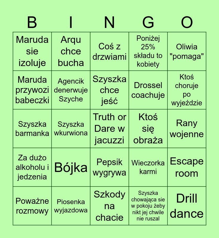 This bingo card has 31 words: Szkody na chacie, Emersix tańczy (sam lub z sąsiadką), Szyszka wkurwiona, Ben zgonuje, Maruda sie izoluje, Coś z drzwiami, Agencik denerwuje Szyche, Wieczorka karmi, Ktoś się obraża, Szyszka chowająca sie w pokoju żeby nikt jej chwile nie ruszal, Rany wojenne, Truth or Dare w jacuzzi, Drill dance, Ranking stópek, Ktoś choruje po wyjeździe, Max Burgers, Escape room, Bójka, Za dużo alkoholu i jedzenia, Pepsik wygrywa, Oliwia "pomaga", Bławatki hojny, Poważne rozmowy, Arqu chce bucha, Drossel coachuje, Maruda przywozi babeczki, Poniżej 25% składu to kobiety, Szyszka barmanka, Piosenka wyjazdowa, Szyszka chce jeść and Kajaki.
