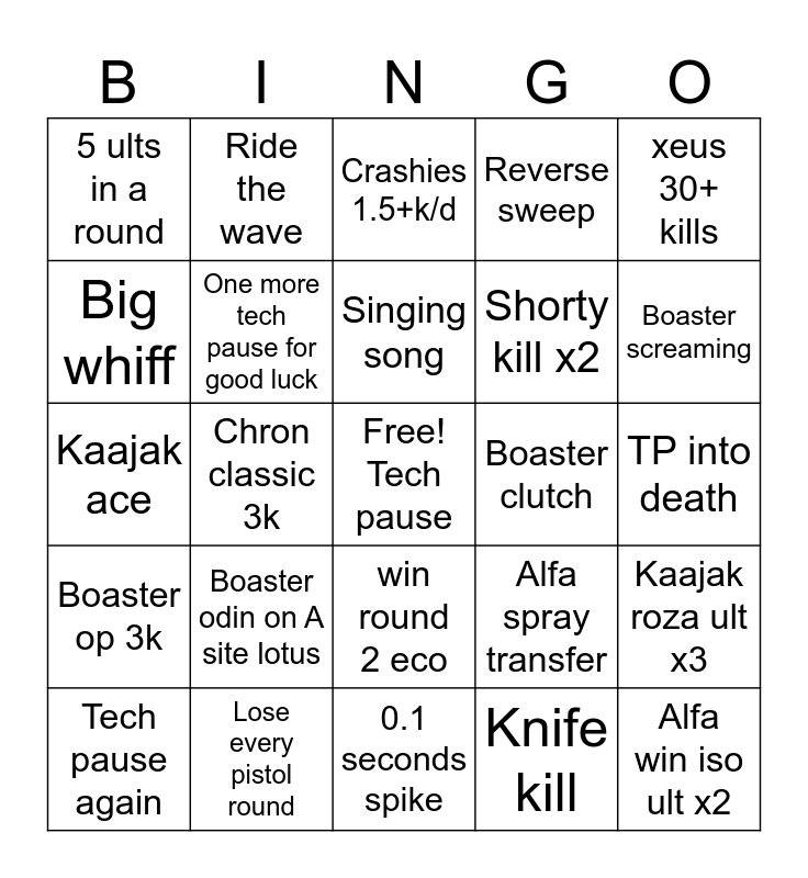 This bingo card has a free space and 24 words: Boaster odin on A site lotus, Lose every pistol round, Singing song, Tech pause again, xeus 30+ kills, 5 ults in a round, Big whiff, Ride the wave, Boaster clutch, win round 2 eco, Shorty kill x2, Kaajak ace, Alfa spray transfer, Kaajak roza ult x3, One more tech pause for good luck, Knife kill, TP into death, Crashies 1.5+k/d, Boaster screaming, Chron classic 3k, Alfa win iso ult x2, Boaster op 3k, Reverse sweep and 0.1 seconds spike.
