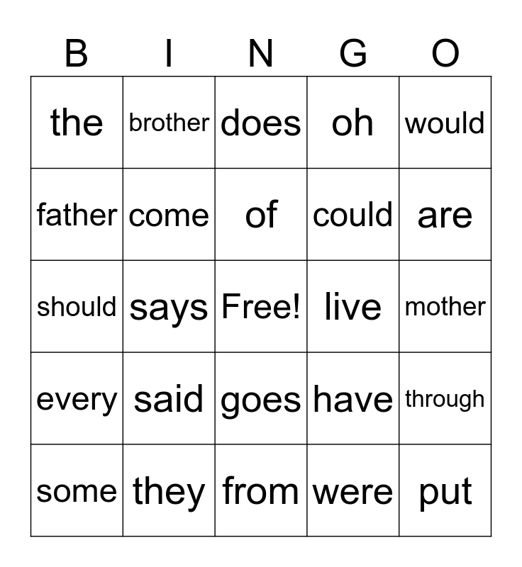 This bingo card has a free space and 25 words: said, from, of, some, would, the, father, brother, live, goes, could, should, have, through, come, other, mother, does, are, says, put, they, every, oh and were.