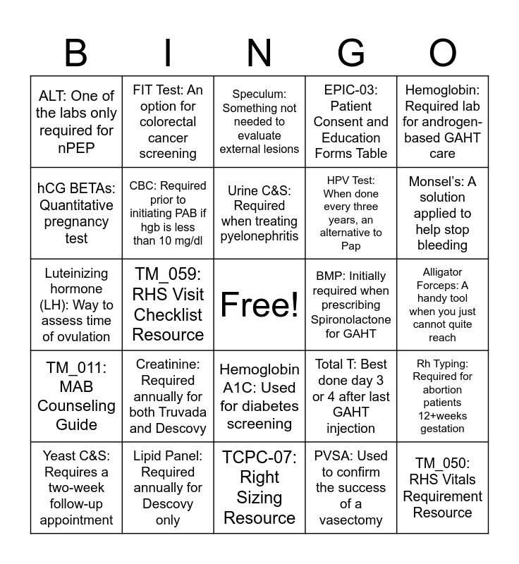 This bingo card has a free space and 24 words: Creatinine: Required annually for both Truvada and Descovy, Lipid Panel: Required annually for Descovy only, Urine C&S: Required when treating pyelonephritis, Yeast C&S: Requires a two-week follow-up appointment, Hemoglobin: Required lab for androgen-based GAHT care, ALT: One of the labs only required for nPEP, hCG BETAs: Quantitative pregnancy test, FIT Test: An option for colorectal cancer screening, BMP: Initially required when prescribing Spironolactone for GAHT, Hemoglobin A1C: Used for diabetes screening, HPV Test: When done every three years, an alternative to Pap, Luteinizing hormone (LH): Way to assess time of ovulation, Total T: Best done day 3 or 4 after last GAHT injection, Rh Typing: Required for abortion patients 12+weeks gestation, CBC: Required prior to initiating PAB if hgb is less than 10 mg/dl, PVSA: Used to confirm the success of a vasectomy, Alligator Forceps: A handy tool when you just cannot quite reach, Speculum: Something not needed to evaluate external lesions, Monsel’s: A solution applied to help stop bleeding, TM_059: RHS Visit Checklist Resource, TM_050: RHS Vitals Requirement Resource, TM_011: MAB Counseling Guide, EPIC-03: Patient Consent and Education Forms Table and TCPC-07: Right Sizing Resource.