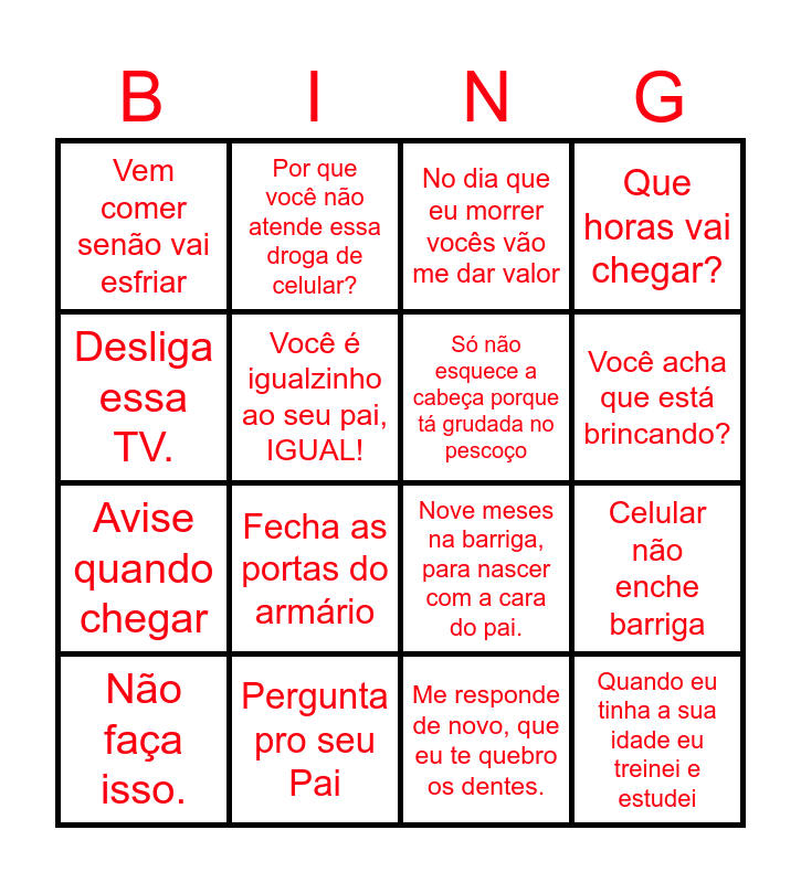This bingo card has 56 words: MÃE, Quando você for dono do próprio nariz, você faz o que quiser, Enquanto estiver no mesmo teto que eu, vai fazer o que eu mandar, Vem comer senão vai esfriar, Vou contar até 3…, Vai sair com quem?, Só não esquece a cabeça porque tá grudada no pescoço, Se eu for ai e achar, vou esfregar na sua cara!, Avise quando chegar, Leva um casado., Que horas vai chegar?, Já ta vindo?, Antes da meia noite está em casa, Na volta a gente compra., Se correr apanha dobrado., Me escute., Desliga essa TV., Celular não enche barriga, A TV tá falando pra parede?, Não faça isso., Pergunta pro seu Pai, Mamãe te ama!, No meu tempo não era assim!, No dia que eu morrer vocês vão me dar valor, Você não é todo mundo, Você acha que está brincando?, Você não tá falando com seus amigos, Vai lavar essa boca, Fecha as portas do armário, Quando a gente chegar em casa, a gente conversa, Eu avisei, não avisei?, Nem me pede nada hoje!, Vontade de....., Nunca mais eu compro...., Me responde de novo, que eu te quebro os dentes., Você é igualzinho ao seu pai, IGUAL!, Nove meses na barriga, para nascer com a cara do pai., Tudo eu nessa casa!, Quando eu tinha a sua idade eu treinei e estudei, Por que você não atende essa droga de celular?, Tá levando um casaco? Vai esfriar, heim!, Você me respeite, eu sou sua mãe!, Como liga isso aqui?, Arruma a bagunça, A louça é sua, Quem é essa aí?, Levanta a bunda dessa cadeira, Desliga esse celular, Não quero ouvir um PIU, Isso não é um quarto, é um chiqueiro, Você é tudo pra mim, Em casa a gente conversa, Não fez mais que sua OBRIGAÇÃO!, Coração de MÃE não se engana, Mãe! Mãe! Mãe! QUIÉÉÉ? and Feliz dia das MÃES!.