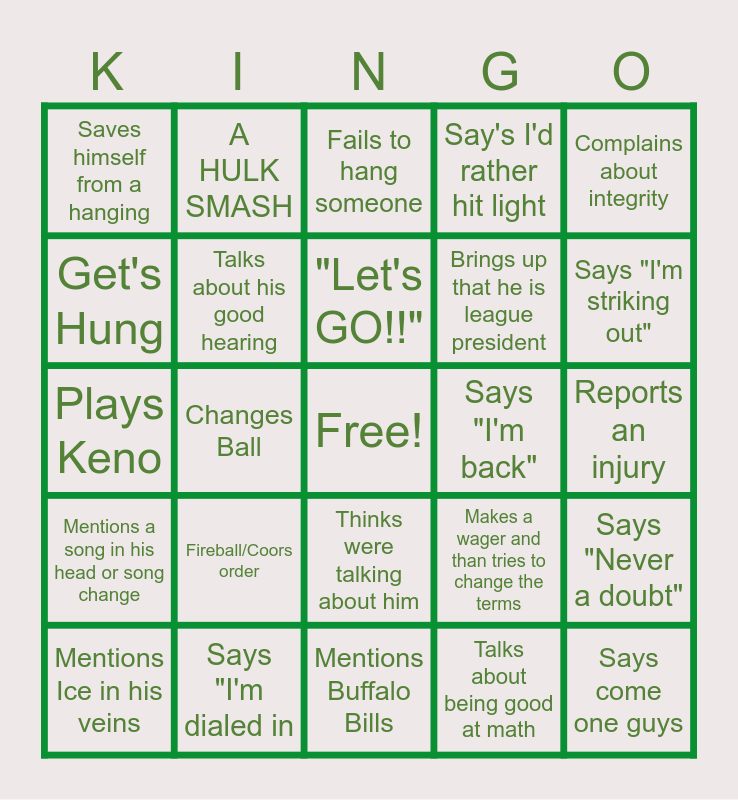 This bingo card has a free space and 30 words: Says "I'm dialed in, Holds up the team buying scratchers, Changes Ball, Says he is the captain, Saves himself from a hanging, Fails to hang someone, Talks about his good hearing, Thinks were talking about him, Says "I'm back", Mentions Buffalo Bills, Reports an injury, Says come one guys, Talks about being good at math, Specifically mentions Josh Allen, Says "I'm striking out", Takes offense to a conversation not about him, Makes a wager and than tries to change the terms, Mentions a song in his head or song change, Fireball/Coors order, Complains about integrity, Plays Keno, Misses a 10 pin, A HULK SMASH, Brings up that he is league president, Get's Hung, Say's I'd rather hit light, Says "Never a doubt", Mentions Ice in his veins, "Let's GO!!" and pulls a joker.