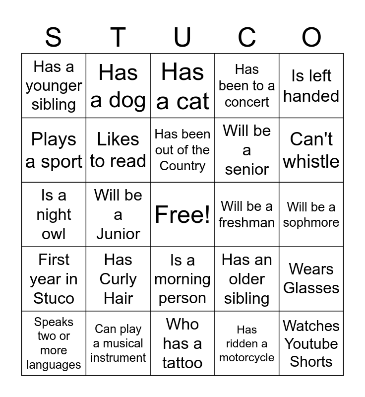 This bingo card has a free space and 24 words: Has Curly Hair, Can play a musical instrument, Has been out of the Country, Speaks two or more languages, Is left handed, Has a younger sibling, Plays a sport, Has a dog, Will be a freshman, Is a morning person, Will be a senior, Is a night owl, Has an older sibling, Wears Glasses, Likes to read, Has ridden a motorcycle, Will be a sophmore, Has a cat, Can't whistle, Will be a Junior, Watches Youtube Shorts, First year in Stuco, Has been to a concert and Who has a tattoo.