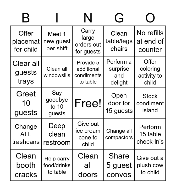 This bingo card has a free space and 24 words: Deep clean restroom, Help carry food/drinks to table, Provide 5 additional condiments to table, Clean booth cracks, No refills at end of counter, Offer placemat for child, Clear all guests trays, Meet 1 new guest per shift, Open door for 15 guests, Give out ice cream cone to child, Perform a surprise and delight, Greet 10 guests, Change all compactors, Perform 15 table check-in's, Clean all windowsills, Share 5 guest convos, Stock condiment island, Carry large orders out for guests, Offer coloring activity to child, Say goodbye to 10 guests, Give out a plush cow to child, Change ALL trashcans, Clean table/legs chairs and Clean all doors.