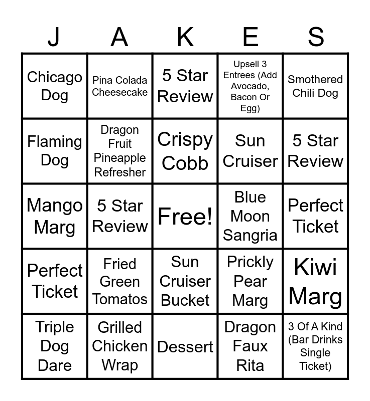 This bingo card has a free space and 24 words: Fried Green Tomatos, Grilled Chicken Wrap, Crispy Cobb, Triple Dog Dare, Smothered Chili Dog, Chicago Dog, Flaming Dog, Pina Colada Cheesecake, Blue Moon Sangria, Sun Cruiser Bucket, Sun Cruiser, Mango Marg, Prickly Pear Marg, Kiwi Marg, Dragon Fruit Pineapple Refresher, Dragon Faux Rita, Perfect Ticket, 5 Star Review, 5 Star Review, 5 Star Review, 3 Of A Kind (Bar Drinks Single Ticket), Perfect Ticket, Upsell 3 Entrees (Add Avocado, Bacon Or Egg) and Dessert.