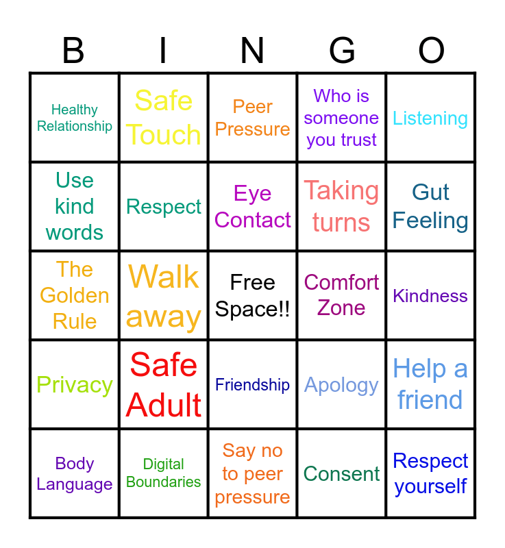 This bingo card has a free space and 34 words: Personal Space, Consent, Saying no, Trust, Privacy, Respect, Listening, Body Language, Safe Touch, Time Alone, Eye Contact, Peer Pressure, Assertive Voice, Red Flag, Comfort Zone, Gut Feeling, Digital Boundaries, The Golden Rule, Safe Adult, Apology, Friendship, Stand up for yourself, Healthy Relationship, Kindness, Say no to peer pressure, Respect yourself, Who is someone you trust, Hands to yourself, Taking turns, Use kind words, It is ok to say stop, Walk away, Help a friend and No means No.