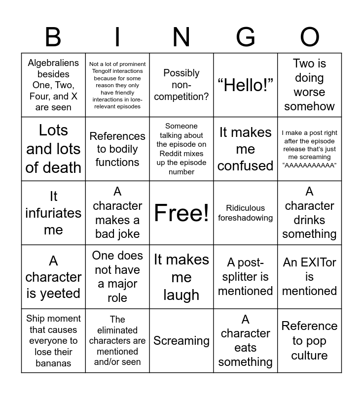 This bingo card has a free space and 24 words: One does not have a major role, The eliminated characters are mentioned and/or seen, Someone talking about the episode on Reddit mixes up the episode number, Ship moment that causes everyone to lose their bananas, Two is doing worse somehow, Algebraliens besides One, Two, Four, and X are seen, Lots and lots of death, Not a lot of prominent Tengolf interactions because for some reason they only have friendly interactions in lore-relevant episodes, Ridiculous foreshadowing, It makes me laugh, It makes me confused, It infuriates me, A post-splitter is mentioned, An EXITor is mentioned, References to bodily functions, A character eats something, A character drinks something, Possibly non-competition?, I make a post right after the episode release that’s just me screaming “AAAAAAAAAAA”, A character makes a bad joke, Reference to pop culture, A character is yeeted, “Hello!” and Screaming.