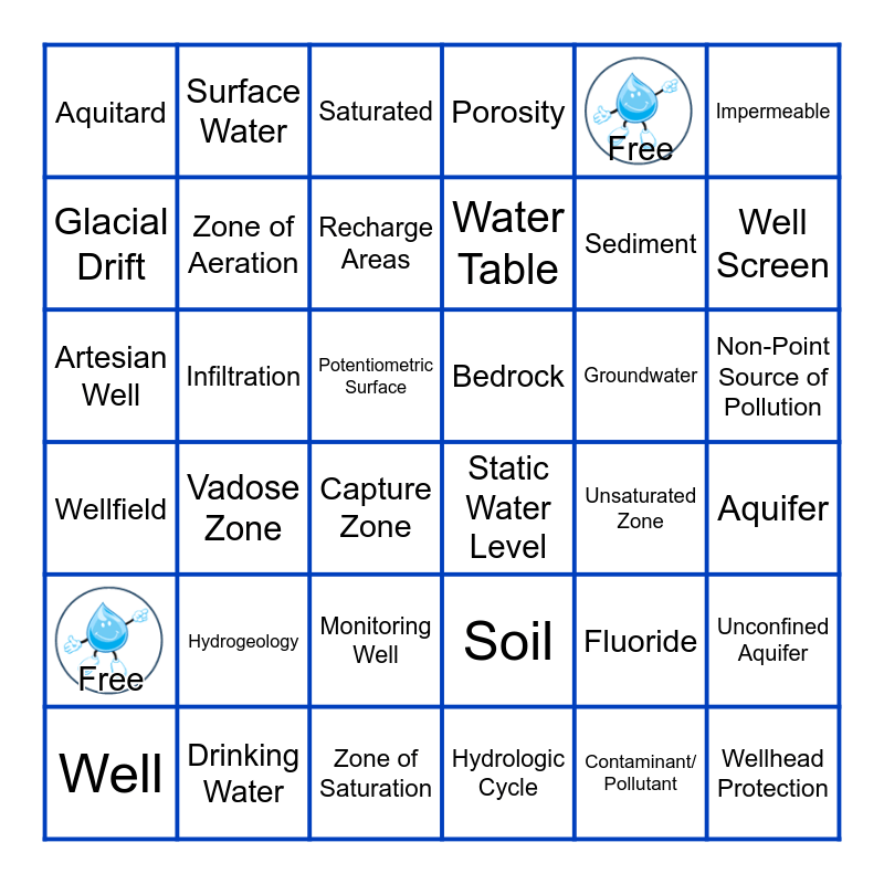 This bingo card has 2 images and 42 words: Wellfield, Infiltration, Permeability, Porosity, Groundwater, Aquifer, Glacial Drift, Capillary Fringe, Saturated, Water Table, Sediment, Well Screen, Aquitard, Zone of Aeration, Zone of Saturation, Bedrock, Contaminant/ Pollutant, Non-Point Source of Pollution, Free, Surface Water, Recharge Areas, Soil, Unsaturated Zone, Impermeable, Well, Drinking Water, Capture Zone, Chlorine, Fluoride, Wellhead Protection, Point Source of Pollution, Hydrogeology, Potentiometric Surface, Static Water Level, Transmissivity, Unconfined Aquifer, Artesian Well, Vadose Zone, Monitoring Well, Hydrologic Cycle, Free and Drawdown.