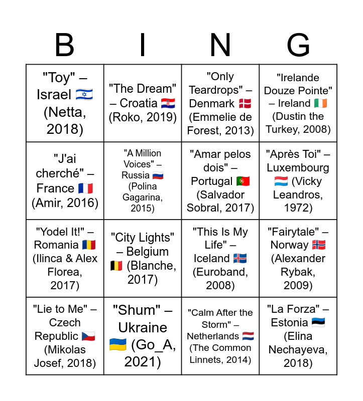 This bingo card has 31 words: Free!, "Waterloo" โ Sweden ๐ธ๐ช (ABBA, 1974), "Fairytale" โ Norway ๐ณ๐ด (Alexander Rybak, 2009), "Satellite" โ Germany ๐ฉ๐ช (Lena, 2010), "Toy" โ Israel ๐ฎ๐ฑ (Netta, 2018), "Only Teardrops" โ Denmark ๐ฉ๐ฐ (Emmelie de Forest, 2013), "Amar pelos dois" โ Portugal ๐ต๐น (Salvador Sobral, 2017), "Zitti e buoni" โ Italy ๐ฎ๐น (Mรฅneskin, 2021), "Shum" โ Ukraine ๐บ๐ฆ (Go_A, 2021), "SloMo" โ Spain ๐ช๐ธ (Chanel, 2022), "Calm After the Storm" โ Netherlands ๐ณ๐ฑ (The Common Linnets, 2014), "Lie to Me" โ Czech Republic ๐จ๐ฟ (Mikolas Josef, 2018), "Snap" โ Armenia ๐ฆ๐ฒ (Rosa Linn, 2022), "My Number One" โ Greece ๐ฌ๐ท (Helena Paparizou, 2005), "City Lights" โ Belgium ๐ง๐ช (Blanche, 2017), "Breathe" โ Moldova ๐ฒ๐ฉ (Zdob ศi Zdub & Advahov Brothers, 2022), "Firefighter" โ Georgia ๐ฌ๐ช (Nutsa Buzaladze, 2024), "Running Scared" โ Azerbaijan ๐ฆ๐ฟ (Ell & Nikki, 2011), "La Forza" โ Estonia ๐ช๐ช (Elina Nechayeva, 2018), "Love Injected" โ Latvia ๐ฑ๐ป (Aminata, 2015), "J'ai cherchรฉ" โ France ๐ซ๐ท (Amir, 2016), "Carpe Diem" โ Slovenia ๐ธ๐ฎ (Joker Out, 2023), "Adrenalina" โ San Marino ๐ธ๐ฒ (Senhit ft. Flo Rida, 2021), "The Dream" โ Croatia ๐ญ๐ท (Roko, 2019), "Yodel It!" โ Romania ๐ท๐ด (Ilinca & Alex Florea, 2017), "A Million Voices" โ Russia ๐ท๐บ (Polina Gagarina, 2015), "Irelande Douze Pointe" โ Ireland ๐ฎ๐ช (Dustin the Turkey, 2008), "This Is My Life" โ Iceland ๐ฎ๐ธ (Euroband, 2008), "Coming Home" โ Malta ๐ฒ๐น (Firelight, 2014), "Aprรจs Toi" โ Luxembourg ๐ฑ๐บ (Vicky Leandros, 1972) and "Mall" โ Albania ๐ฆ๐ฑ (Eugent Bushpepa, 2018).