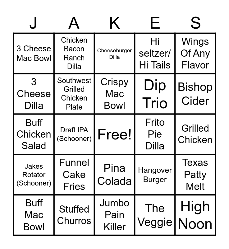 This bingo card has a free space and 24 words: Funnel Cake Fries, Stuffed Churros, Crispy Mac Bowl, Buff Mac Bowl, Wings Of Any Flavor, 3 Cheese Mac Bowl, 3 Cheese Dilla, Chicken Bacon Ranch Dilla, Frito Pie Dilla, Pina Colada, Dip Trio, Buff Chicken Salad, Hangover Burger, Texas Patty Melt, Southwest Grilled Chicken Plate, The Veggie, Grilled Chicken, Cheeseburger Dilla, Bishop Cider, Draft IPA (Schooner), High Noon, Jakes Rotator (Schooner), Hi seltzer/ Hi Tails and Jumbo Pain Killer.