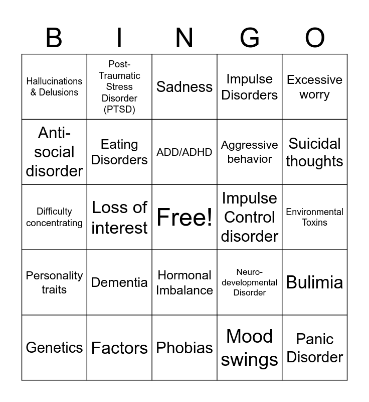 This bingo card has a free space and 49 words: Depression, Panic Disorder, Schizophrenia, Phobias, Dementia, Bipolar Disorder, Post-Traumatic Stress Disorder (PTSD), Anxiety, Anti-social disorder, Obsessive Compulsive Disorder (OCD), Eating Disorders, Impulse Disorders, Bulimia, Neuro-developmental Disorder, Gambling, Alzheimer's Disease, ADD/ADHD, Impulse Control disorder, Addiction Disorder, Excessive worry, Loss of interest, Mood swings, Hallucinations & Delusions, Aggressive behavior, Drug use, Suicidal thoughts, Genetics, Brain Chemistry, Hormonal Imbalance, Personality traits, Coping mechanisms, Past Trauma, Traumatic Brain Injury (TBI), Social Isolation, Factors, Stigmas, Adverse Childhood Events (ACE), Stressful Life Events, Environmental Toxins, Lifestyle, Alcoholism, Withdrawal from friends/family, Low energy, Paranoia, Difficulty concentrating, Sadness, Sudden overwhelming Fear, Confused thinking and Changes in personal hygiene or self-care.