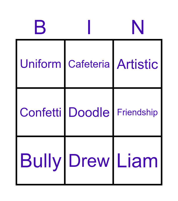 This bingo card has a free space and 11 words: Jordan, Drew, Liam, Bully, Cafeteria, Artistic, Friendship, Trust, Confetti, Uniform and Map.