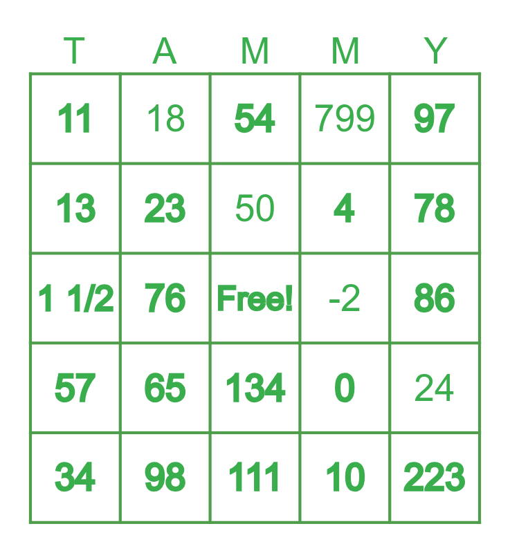 This bingo card has a free space and 29 words: 34, 82, 76, 12, 11, 54, 23, 65, -2, 98, 86, 223, 111, 10, 78, 99, 134, 57, 97, 1 1/2, 0, 9, 4, 13, 799, 18, 24, 50 and 60.