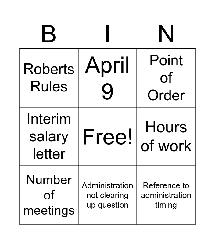 This bingo card has a free space and 22 words: Carsten Stuber, Direct comments to the chair, April 9, Passive aggressive comments to administration, Hours of work, Number of meetings, Roberts Rules, Point of Order, Differentiating attorneys, Peer institutions/industry standard, Exigency policy, Interim salary letter, History of the contract/salary letter, Statutes, Amendment, Dan DiCenso, Ann Sheehy, Kathy Kiel, Giovanni Spani, Reference to administration timing, Administration not clearing up question and Reference to administration not answering question.