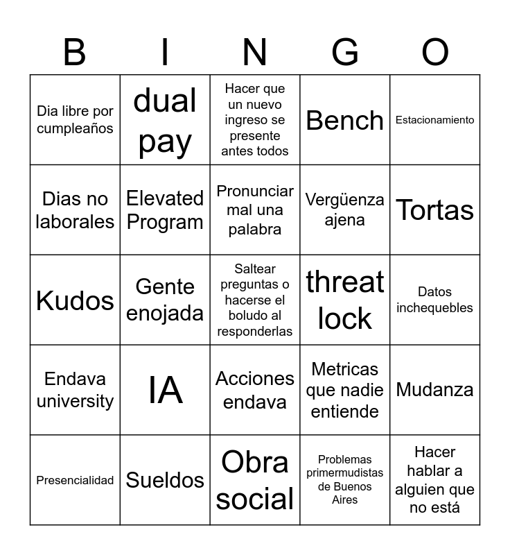 This bingo card has a free space and 24 words: IA, Sueldos, Pronunciar mal una palabra, Presencialidad, Estacionamiento, Dia libre por cumpleaños, Dias no laborales, dual pay, threat lock, Acciones endava, Vergüenza ajena, Kudos, Metricas que nadie entiende, Mudanza, Elevated Program, Problemas primermudistas de Buenos Aires, Datos inchequebles, Hacer que un nuevo ingreso se presente antes todos, Tortas, Gente enojada, Hacer hablar a alguien que no está, Endava university, Bench and Obra social.