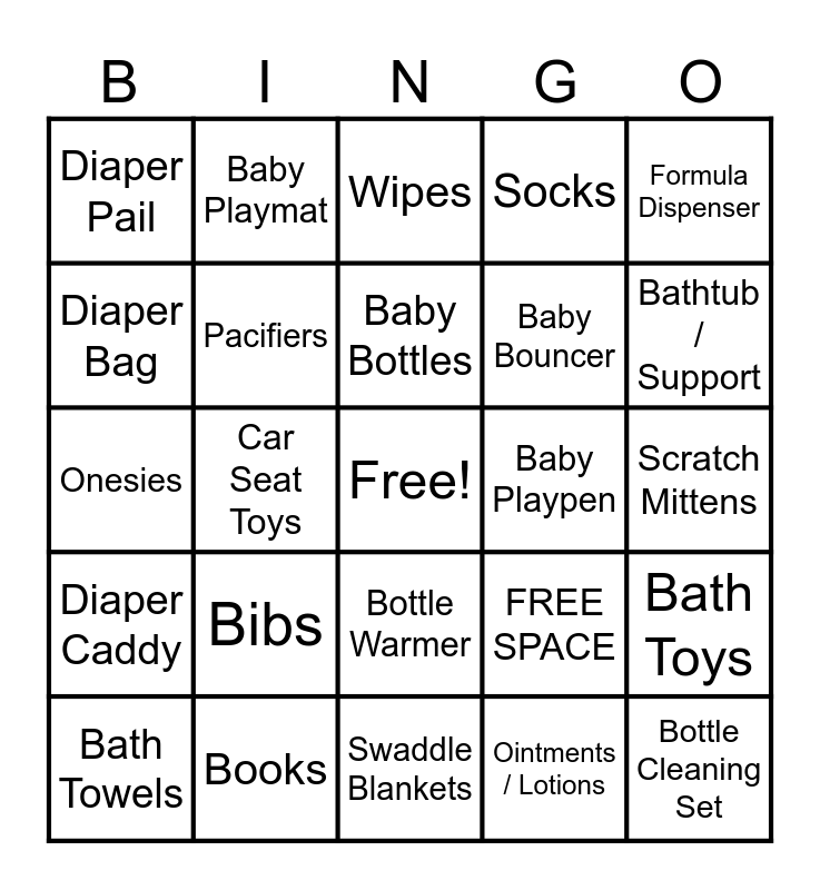This bingo card has a free space and 25 words: Bibs, Swaddle Blankets, Baby Bottles, Bath Towels, Formula Dispenser, Diaper Pail, Diaper Bag, Baby Playmat, Baby Playpen, Bottle Warmer, Baby Bouncer, Onesies, FREE SPACE, Bath Toys, Pacifiers, Teething Toys, Scratch Mittens, Wipes, Bathtub / Support, Car Seat Toys, Bottle Cleaning Set, Books, Diaper Caddy, Socks and Ointments / Lotions.