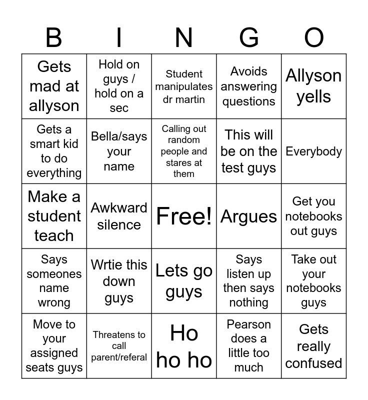 This bingo card has a free space and 35 words: Write this down, Come on guys, Put it on my desk, Bella/says your name, Lets go guys, Avoids answering questions, Gets a smart kid to do everything, I cant hear myself, Calling out random people and stares at them, Role call guys, Make a student teach, Allyson yells, Takes device, Disses someone, Gets mad at allyson, Argues, Pearson does a little too much, Awkward silence, Says someones name wrong, Gets really confused, Says listen up then says nothing, Move to your assigned seats guys, Take out your notebooks guys, Threatens to call parent/referal, Student manipulates dr martin, Everybody, Step by step guys, Check, This will be on the test guys, Get you notebooks out guys, This is key, Ho ho ho, Wrtie this down guys, Hold on guys / hold on a sec and stopx5.