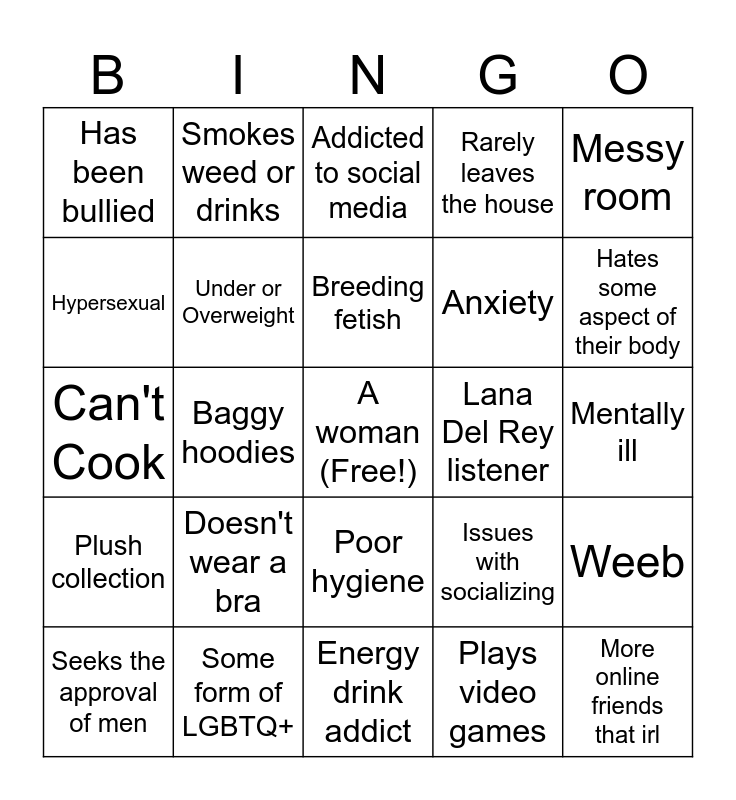 This bingo card has a free space and 24 words: Seeks the approval of men, Doesn't wear a bra, Breeding fetish, Plays video games, Messy room, Has been bullied, Smokes weed or drinks, Addicted to social media, Lana Del Rey listener, Mentally ill, Can't Cook, Under or Overweight, Issues with socializing, Weeb, Hypersexual, Some form of LGBTQ+, Energy drink addict, Rarely leaves the house, Hates some aspect of their body, Plush collection, Baggy hoodies, Poor hygiene, Anxiety and More online friends that irl.