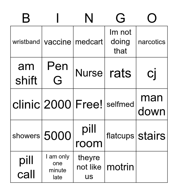 This bingo card has a free space and 24 words: showers, I am only one minute late, pill room, flatcups, narcotics, wristband, vaccine, medcart, rats, stairs, am shift, Pen G, RDO, selfmed, cj, pill call, 2000, Nurse, Im not doing that, man down, clinic, 5000, theyre not like us and motrin.