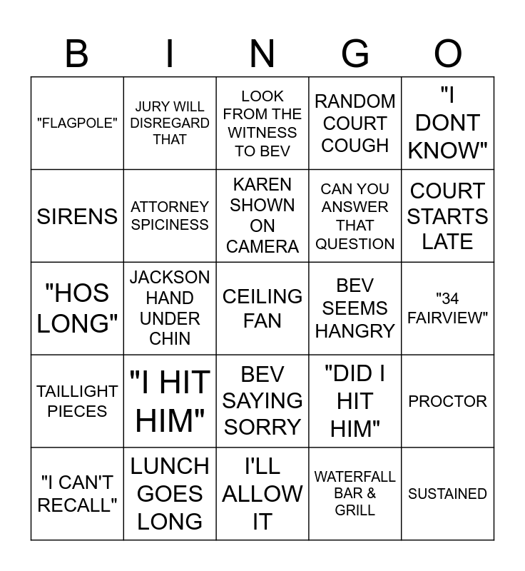 This bingo card has a free space and 34 words: OBJECTION, WATERFALL BAR & GRILL, PAUL O'KEEFE ON CAMERA, BEV TELLING SOMEONE TO SLOW DOWN, TAILLIGHT PIECES, ATTORNEY SPICINESS, "I DONT KNOW", "I CAN'T RECALL", JURY WILL DISREGARD THAT, STRIKE THAT FROM THE RECORD, KAREN SHOWN ON CAMERA, LOOK FROM THE WITNESS TO BEV, "DID YOU SEE A DOG", BEVS BIAS TOWARDS DEFENSE, BEV SEEMS HANGRY, COURT STARTS LATE, LUNCH GOES LONG, "HOS LONG", "I HIT HIM", "DID I HIT HIM", BEV SAYING SORRY, BRENNAN BEING BRENNA- A 5 YR OLD, "FLAGPOLE", "34 FAIRVIEW", I'LL ALLOW IT, SUSTAINED, RANDOM COURT COUGH, I'LL SEE COUNSEL AT SIDEBAH, CAN YOU ANSWER THAT QUESTION, SIRENS, JACKSON ARMS CROSSED, JACKSON HAND UNDER CHIN, PROCTOR and RED SOLO CUP.