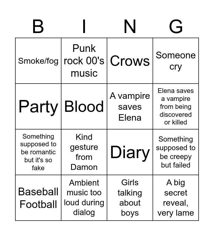 This bingo card has 16 words: Ambient music too loud during dialog, Something supposed to be creepy but failed, Crows, Smoke/fog, Something supposed to be romantic but it's so fake, Punk rock 00's music, Diary, Girls talking about boys, Party, Blood, Baseball Football, Someone cry, Kind gesture from Damon, Elena saves a vampire from being discovered or killed, A vampire saves Elena and A big secret reveal, very lame.