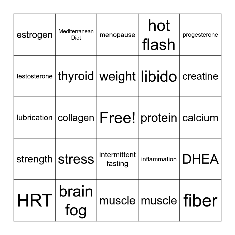 This bingo card has a free space and 24 words: stress, brain fog, weight, HRT, progesterone, estrogen, testosterone, Mediterranean Diet, protein, intermittent fasting, libido, lubrication, inflammation, DHEA, thyroid, muscle, calcium, menopause, creatine, collagen, fiber, strength, hot flash and muscle.