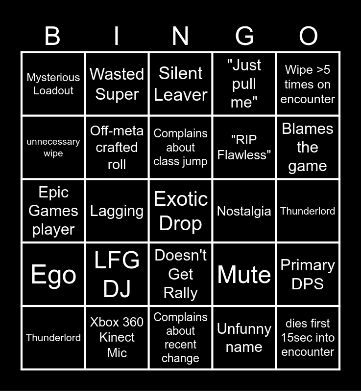 This bingo card has 70 words: Intoxicated Guardian, Thunderlord, Strafe in Well, "I'll ad clear", Xbox 360 Kinect Mic, >1 hour encounter, "Just pull me", OOB, Wipe >5 times on encounter, Enrage, Primary DPS, Failed Skate, Mysterious Loadout, Silent Leaver, Random AFK, Lagging, Doesn't Get Rally, "RIP Flawless", Bad Stats, Ego, Nostalgia, Mute, Blames the game, Double Primary, Wrong/ No surges, streamer strat, Cheese, confidently incorrect, Unfunny name, PvP loadout, Wasted Super, Fireteam Disbands, Transition Length Complaints, "Can someone run ___?" *silence*, DPS worse than div/tractor, Eats on mic, Talks over comms, > 3 hour clear, Argument, unnecessary wipe, dies first 15sec into encounter, LFG DJ, Exotic Drop, Raid Mods, raid.report monitor, Off-meta crafted roll, Thunderlord, Audible Bodily Functions, Roaming Super DPS, Current Events, Sherpa, irl lore, Glaive, Bad callout, Complains about recent change, Movement exotic on boss, Complains about class jump, Guardian Rank Mentioned, 10+ Gilded Title, Background noise, Epic Games player, No Exotic armor, Coping, Final Stand wipe, 3 or more of the same class, First Endgame Content, Someone didn't listen to explanation, Obvious YouTube build, Speedrunner and The Mythical Free Space.