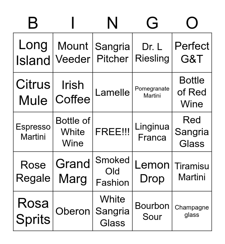 This bingo card has a free space and 24 words: Grand Marg, Oberon, Lamelle, Rosa Sprits, Perfect G&T, Long Island, Citrus Mule, Mount Veeder, Linginua Franca, Smoked Old Fashion, Pomegranate Martini, Espresso Martini, Lemon Drop, Tiramisu Martini, Irish Coffee, Bourbon Sour, Red Sangria Glass, Sangria Pitcher, Bottle of Red Wine, Bottle of White Wine, Champagne glass, Rose Regale, Dr. L Riesling and White Sangria Glass.