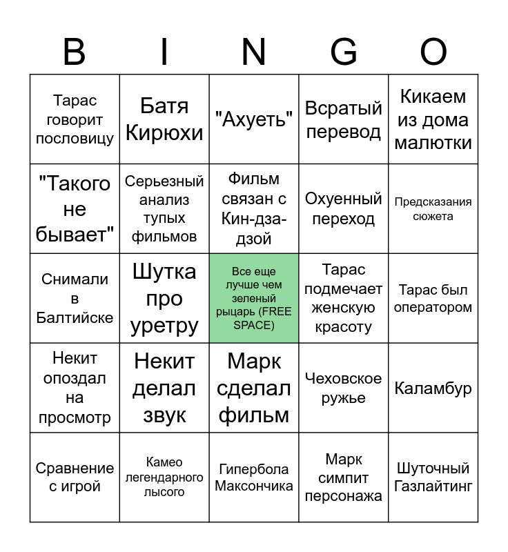 This bingo card has a free space and 24 words: Некит делал звук, Камео легендарного лысого, Фильм связан с Кин-дза-дзой, Сравнение с игрой, Кикаем из дома малютки, Тарас говорит пословицу, "Такого не бывает", Батя Кирюхи, Тарас подмечает женскую красоту, Марк сделал фильм, Охуенный переход, Снимали в Балтийске, Чеховское ружье, Каламбур, Серьезный анализ тупых фильмов, Марк симпит персонажа, Тарас был оператором, "Ахуеть", Предсказания сюжета, Шутка про уретру, Шуточный Газлайтинг, Некит опоздал на просмотр, Всратый перевод and Гипербола Максончика.