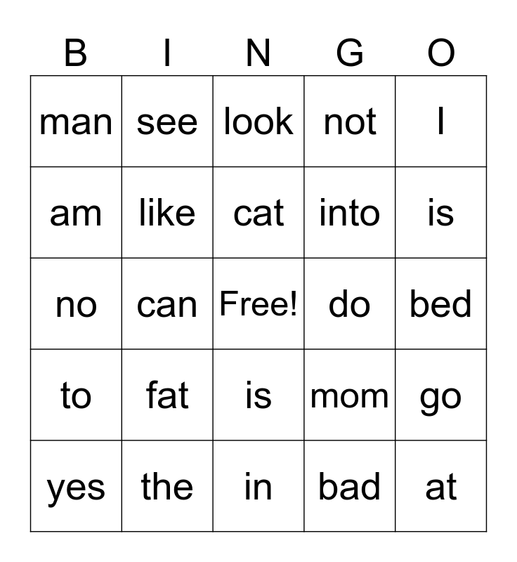This bingo card has a free space and 27 words: mom, dad, into, in, am, look, see, to, do, go, no, not, yes, the, is, his, like, cat, fat, man, bed, bad, can, at, is, I and a.