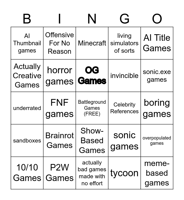 This bingo card has a free space and 24 words: Brainrot Games, P2W Games, OG Games, 10/10 Games, AI Title Games, AI Thumbnail games, Actually Creative Games, Offensive For No Reason, Celebrity References, Show-Based Games, invincible, underrated, sonic games, overpopulated games, horror games, tycoon, boring games, Minecraft, sonic.exe games, FNF games, meme-based games, sandboxes, living simulators of sorts and actually bad games made with no effort.