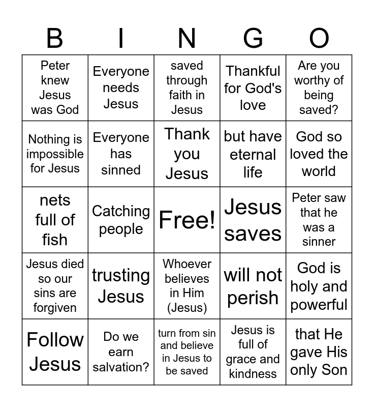 This bingo card has a free space and 29 words: Follow Jesus, How can we be saved?, Catching people, Faith is trusting what God says is true, Peter knew Jesus was God, saved through faith in Jesus, Everyone has sinned, trusting Jesus, Jesus saves, Do we earn salvation?, Peter saw that he was a sinner, that He gave His only Son, turn from sin and believe in Jesus to be saved, Jesus is full of grace and kindness, God so loved the world, Peter worshipped Jesus, Whoever believes in Him (Jesus), Jesus died so our sins are forgiven, Are you worthy of being saved?, nets full of fish, will not perish, saved through faith in Jesus, but have eternal life, Nothing is impossible for Jesus, Thankful for God's love, Everyone needs Jesus, God is holy and powerful, Thank you Jesus and Follow Jesus in good & hard times.
