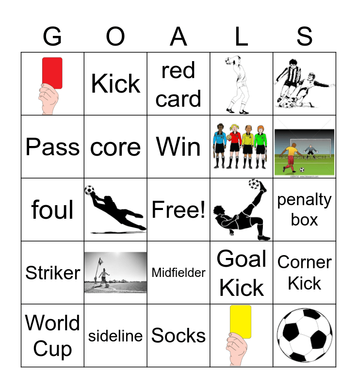 This bingo card has 14 images, a free space and 33 words: Shin Guards, Socks, Uniform, Kick, Shoot, Pass, core, Corner Kick, Goal Kick, Team, Win, Hat Trick, World Cup, Defender, Midfielder, Striker, Keagan, Beckham, Bale, challenge, free kick, sideline, penalty box, corner flag, goal box, sweeper, punt, red card, foul, referee, assist, hand ball and challenge, free kick, sideline, penalty box, strikers, corner flag, mid-fielders, penalty kick, sweeper, corner kick, goal box, offsides, trap, punt, goalkeeper, pass, red card, foul, header, penalty, yellow card, assist, hand ball and referee..