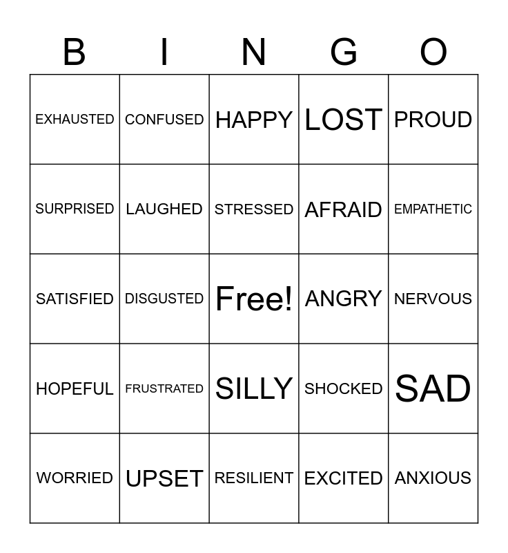 This bingo card has a free space and 24 words: FRUSTRATED, UPSET, STRESSED, WORRIED, PROUD, EXHAUSTED, SURPRISED, CONFUSED, ANGRY, SILLY, AFRAID, SATISFIED, SHOCKED, SAD, LAUGHED, EXCITED, NERVOUS, HAPPY, EMPATHETIC, DISGUSTED, ANXIOUS, HOPEFUL, LOST and RESILIENT.